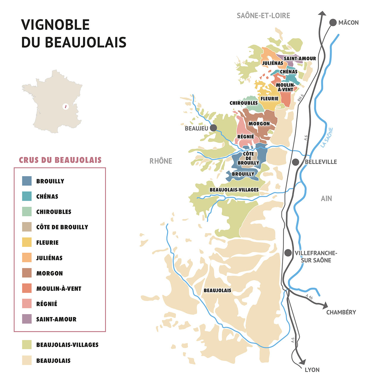 OrigineL’appellation Beaujolais est produite essentiellement dans la région sud de Villefranche-sur-Saône. Le vignoble s'étend sur 9 700 hectares.
